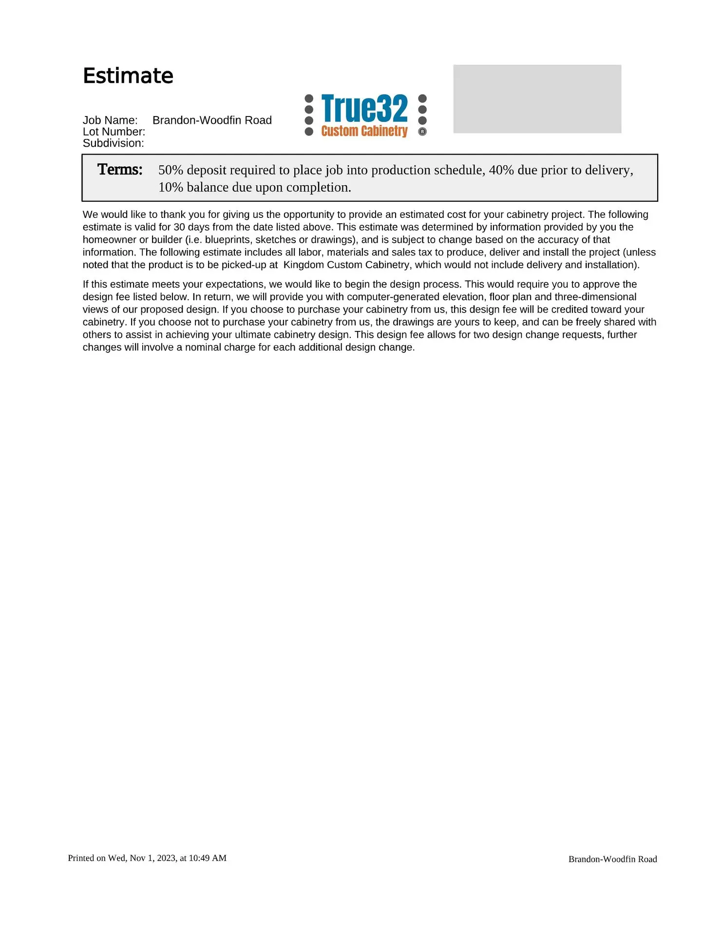 - A check for the design fee/retainer shown on the estimate